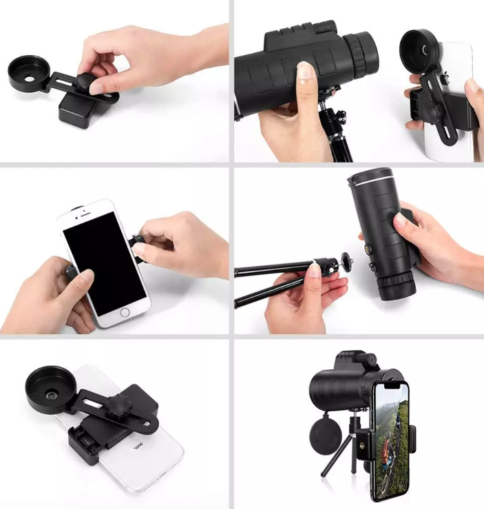 Connecting to your phone is simple. First, align the holder with your smartphone camera. Then, attach the phone and connector to the telescope. See instructions on the right for a visual.